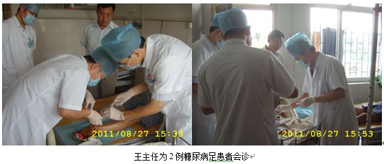 2011年8月27日下午三时,中国烧伤创疡杂志副总编辑、中国中西医结合学会烧伤专业委员会常委兼秘书、北京烧伤创疡研究所副所长、临床研究部主任王洪生研究员应贵港市中医院韦赤勇院长的邀请,在广西田东县人民医院进行临床学术交流后,王主任不辞辛苦从田东县赶赴贵港市中医医院到为该院收治的2例糖尿病足病人会诊,到达贵港市中医医院后,在韦赤勇院长陪同下,王主任深入该医院创伤该科、烧伤创疡科病区,先后为2例糖尿病足患者会诊,并亲自为这2例病人做示范清创手术,并在清创时讲解糖尿病足创面处理要点,得到了该院韦院长、该科室主任杨柳明和主管医生的高度认同。会诊结束后,韦赤勇院长又与王主任就该院烧伤创疡专科近期和中长期发展规划进行了广泛而深入的交流和沟通,韦院长表示一定要让我国著名生命科学家、医学家、人体再生复原科学的创立者徐荣祥教授创立的再生复原疗法在该医院开花结果,通过再生复原疗法对糖尿病足等难愈性创面独特的疗效将该医院的创伤外科、烧伤创疡科打造成贵港市的优势、特色专科,最后韦院长还表示将派一名医生到国内较为成熟的医院去进修再生复原技术,为打造难愈性创面优势专科尽快培养人才。