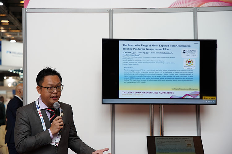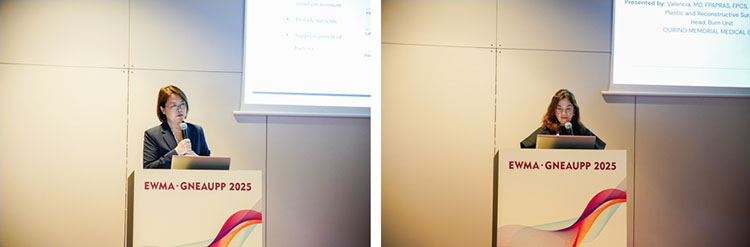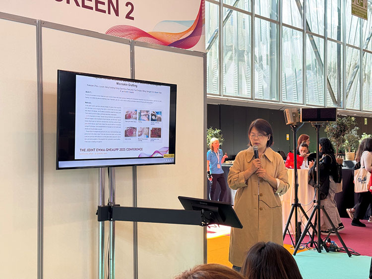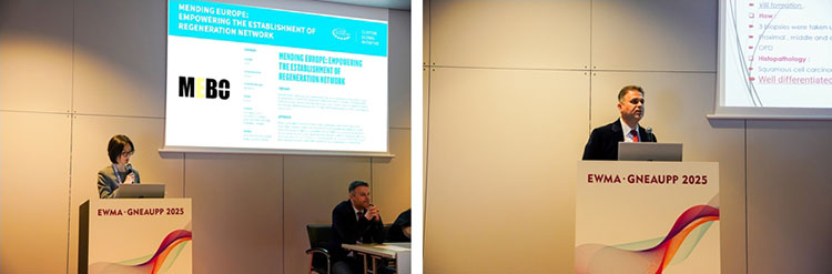 除展台的展示外,再生医疗技术更是在会议中掀起一次次学术浪潮。大会首日下午,题为“重塑创面治疗:从临床实践到技术创新”的再生医疗技术研讨会顺利召开。作为推动克林顿全球倡议(CGI)——“欧洲修复计划:赋能欧洲再生医疗网络构建”的又一关键活动,研讨会围绕再生医疗技术在急慢性创面中的创新应用展开讨论。来自沙特 Sulaiman Al Habib医疗集团外科的Ziad Dalloul首先分享了马乔林溃疡的临床管理策略,深入探讨了再生医疗技术在复杂创面中的应用及优势。随后,西安市第九医院烧伤整形科周小茜带来了应用自创微粒皮浆种植结合再生医疗技术治疗慢性创面的演讲,充分展示了该技术在促进慢性创面愈合中的优势。最后,来自菲律宾Quirino Memorial医疗中心烧伤科的Nikki Valencia分享了一项最新的系统回顾,全面证实了再生医疗技术在烧伤治疗中的综合疗效、安全性、疼痛缓解及感染预防方面的显著疗效。
