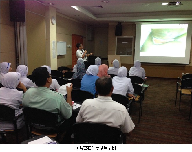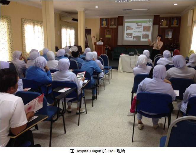 10月30日,今天的CME是在Hospital Alor Gajar, 这是一个今年二月份刚开设的偏远医院,没有固定的医生,医生们来自不同的医院,在规定的时间来该院出诊。这里固定开设的只有两个部门,创面治疗诊所及妇产科诊所,创面门诊每天约接待25位病人。该院的医务官比较积极的推广再生疗法,但由于认识误区,应用仅限于创面治疗后期。张美艳反复与之交流纠正概念及理解错误,强调再生疗法使用越早越好。CME的出席者多为护士和医助,听讲很认真,能准确回答问题。随后,这位医务官分享了美宝在该院试用的成功案例。结束后,很多护士索要样品,询问价格及更多的适应症。之后的跟踪了解到,医务官已经为再生疗法申请到院方的独立预算,并希望有更多的交流培训活动等。