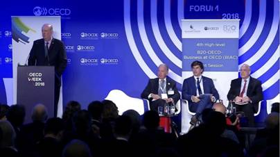 2018年5月底,经济合作与发展组织(简称经合组织,OECD)在巴黎总部经合组织会议中心举行2018经合组织周活动,会议议程也包括G20(二十国集团)贸易会谈和B20(二十国集团商业论坛)研讨会。继应邀参加今年3月8号B20在阿根廷首都主办的联合国世界妇女节敲钟仪式后,美宝集团总裁徐鹏再次参与B20会议,出席了2018经合组织周活动,共同探讨当前形势下世界面临的经贸、科技、政策等方面的挑战和解决之道。