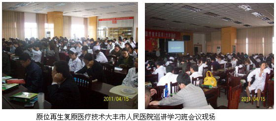 盐城市是皖南事变后中国共产党重新组建新四军的诞生地,是中国革命的老区具有光荣的革命传统。2011年4月15日~20日应盐城大丰市人民医院的邀请中国中西医结合学会烧伤专业委员会常委、北京烧伤创疡研究所临床部杜福勤主任,南京中医药大学附属医院、连云港市中医院烧伤创疡科陆敏康主任在大丰市人民医院会议厅举办再生医疗技术巡讲学习班。会议由医务科单保安科长主持,参加会议的有外科、骨科、神经科、妇产科、肛肠科、内科、内分泌科、皮肤科、口腔科及大丰市中医院、市第二人民医院、市第三人民医院、大桥镇中心卫生院、草堰镇卫生院、南阳镇卫生院、大中镇第二卫生院、新丰镇第二卫生院等院长、科主任和义务人员200余人参加了学习。