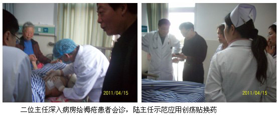 讲课结束后二位主任深入病房和乡镇卫生院会诊,陆主任亲自为褥疮患者换药,指导示范创疡贴的换药深受患者家属和医护人员的欢迎。
