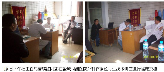 4月19日下午杜福勤主任和吉晓红同志在盐城同洲医院外科作原位再生技术在烧伤创伤溃疡创面中的临床实践讲座,并对临床的实际遇到的问题进行了交流,结合临床面对面的交流沟通,受到良好的效果。