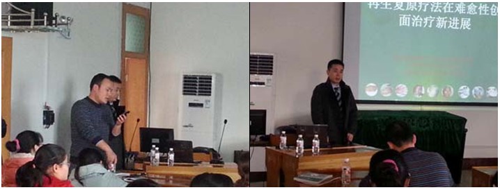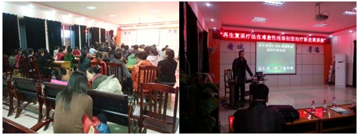 全院各科室共70余人参加了此次学术讲座。专题讲座由该院姚文兴院长主持。王主任在讲座中结合了大量的临床病例图片及录像资料,主要针对深度烧伤及各类难愈性创伤、溃疡创面、糖尿病足、放射性溃疡的规范化处理方法与技巧、注意事项等进行了细致讲解,强调创面处理要大胆清创、减压、去除坏死组织,并保持创面生理的湿润环境,实现创面的再生复原,并建议对病人深达真皮层以下愈合后创面应进行防疤处理治疗。各种创面治疗后理想的愈合效果让医生们对再生医疗技术有了更深刻的认识,得到了在场医护人员的认可。