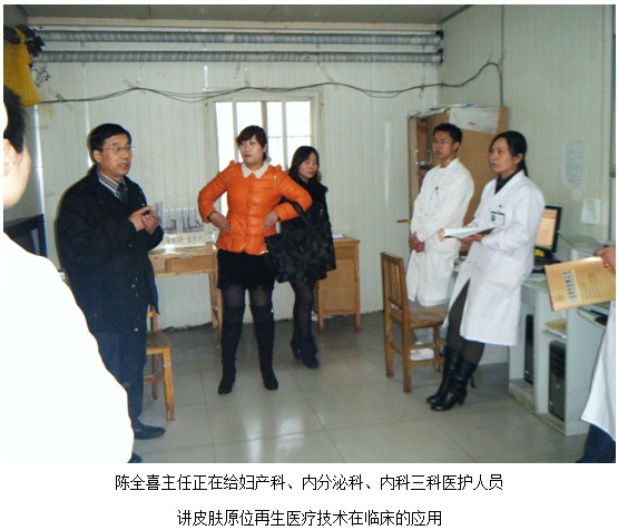 陈全喜主任在培训中强调说,人体皮肤原位再生医疗技术是中国生命科学家徐荣祥教授创立的,皮肤原位再生医疗技术的原理是让创面立体式暴露在一个生理湿润环境内,自动液化排除坏死皮肤,保护残存皮肤细胞再生复原创面。并就皮肤原位再生医疗技术实现皮肤原位再生修复的原理进行了详细的讲解。