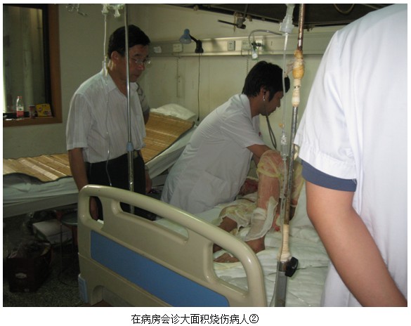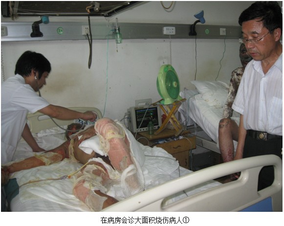 陈全喜主任到达油田医院后,张主任介绍,该院来了一位大面积烧伤病人,烧伤面积87%,已经2天了,并采用MEBT/MEBO进行治疗,并邀请陈主任确定是否达到了MEBO技术的要求。陈主任立即赶往病房,病人平稳地躺在病床上,全身用MEBO油沙半暴露疗法。经检查,各项指标正常。会诊后,陈主任较为满意,陈主任与张主任确定将在科室晨起开会时,做讲座。