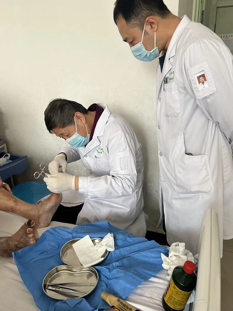 2023年3月28日,应霍山县县医院烧伤科张贤卿主任邀请,中国中西医结合学会烧伤专业委员会医疗部张强主任会诊了几例慢创病人,变换药边讲解换药技巧及油纱制作,后在科室给医护人授课培训,8人参会,张主任的讲解得到大家高度认可!再生医疗技术极大提高了县级医院创面病人的治疗水平。