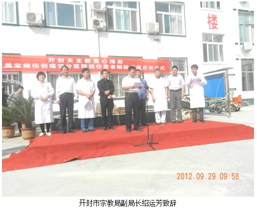 活动启动仪式在医院的精心组织下准时举行。开封市宗教局绍运芳副局长,开封市天主教柴玉良、赵水泉神父,天主教仁爱置业公司经理连汴生先生,中国烧伤创疡科技中心医疗部主任金党军先生,河南省中西医结合学会烧伤专业委员会秘书长陈全喜先生,开封美宝烧伤创疡空分医院院长王文芳、副院长李明等参加了启动仪式。
