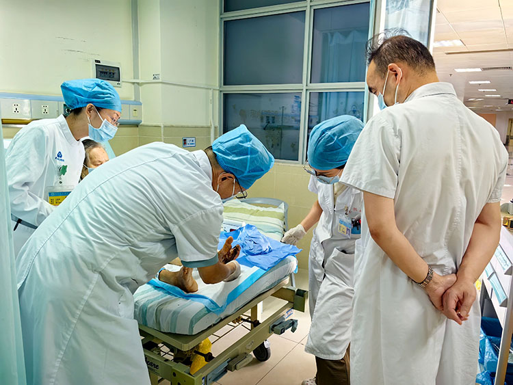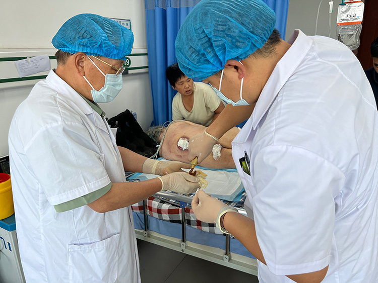 2025年7月12日,中国中西医结合学会烧伤专业委员会常务委员、《中国烧伤创疡杂志》副总编辑王洪生,受邀到漳州市龙海区榜山卫生院会诊一例糖尿病足患者,王教授现场教学,亲自示范清创和换药,得到了医护人员和患者家属的一致好评!