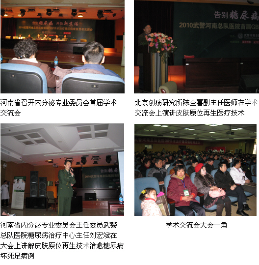 2010年4月20日,在河南省武警医院糖尿病治疗中心召开了河南省第一次糖尿病专业学术交流会,会议上首先河南省内分泌专业委员会主任委员、武警总队医院糖尿病治疗中心主任刘宏斌与大家一起分享了他应用原位再生医疗技术治愈糖尿病坏死足患者的经验,同时将北京烧伤创疡研究所副主任医师陈全喜介绍给大家。陈全喜主任向各位专家介绍了原位再生医疗技术,应用该技术治疗糖尿病皮肤溃疡、糖尿病坏死足的方法与换药技巧,并利用临床大量的病例资料及图片向大家展示了再生医疗技术良好的治疗效果。陈主任精彩的演讲及再生医疗技术神奇的治疗结果引起了会议上的学者、专家的高度重视,专家们认为这是目前科学前沿的最新科研成果,并表示坏死足趾不截趾、肢是当前医生们认为最完美的治疗结果,同时给患者带来终身的幸福,很值得推广使用。