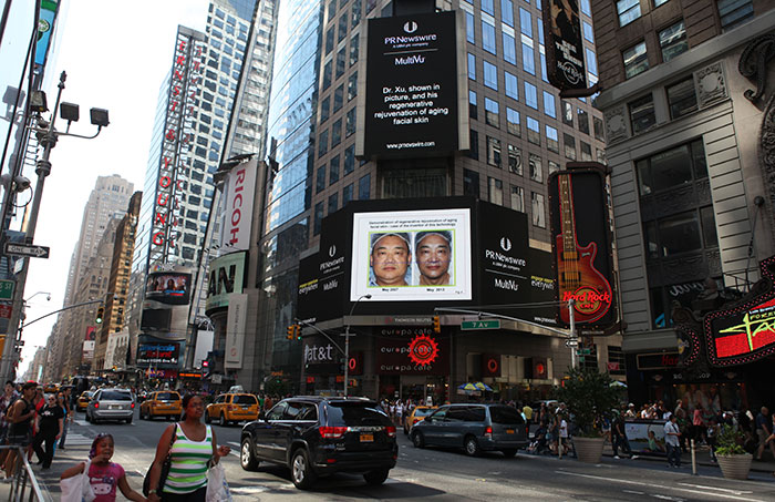 路透社再次在纽约时代广场大屏幕报道人体器官再生技术发明人徐荣祥的新闻,并配发徐荣祥本人再生还童的照片。