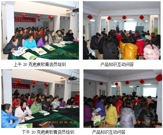 2012年3月6号,中国中西医结合学会烧伤专业委员会、北京美宝烧伤疮疡研究所临床部烧伤专家金党军教授,在随州天力医药公司会议室,分上午、下午两场对天力连锁店所有店员做了疤痕软膏的产品培训,同时针对疤痕的形成、美宝疤痕软膏的作用机理、使用要点等各方面进行了深入浅出的培训。随州天力医药公司连锁公司政策执行部杜燕部长和随州天力连锁公司94位店员参加了此次培训,会上气氛热烈,店员纷纷咨询。天力医药公司龚总对此次培训给予了很高的评价,认为此次培训对店员的日常保健意识和疤痕软膏的销售拉动将有很好帮助。