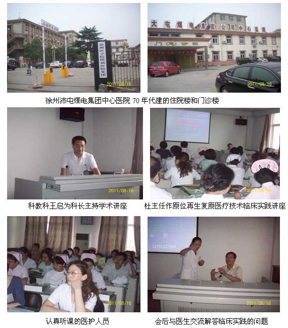 2011年8月16日,应徐州沛屯煤电集团中心医院科教科王启为科长的邀请,中国中西医结合学会烧伤专业委员会委员、北京美宝烧伤创疡研究所临床部杜福勤主任和学会驻南京办事处刘恒主任、周银梅一起在该院举办国家中医药管理局医学继教项目—再生复原医疗技术学术讲座。
