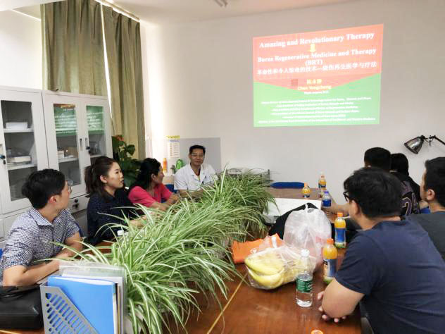 9月11日上午,蒙古来访专家一行来到烧伤创疡科病房区参观交流,参观了再生医学疗法治疗糖尿病足、褥疮、癌性创面及两例85%以上的大面积烧伤患者在内共三十多位患者的治疗情况。随后去门诊了解门诊患者的病情及就诊情况。下午,陈永翀教授在会议室以课件形式给来访专家们讲解了再生医学疗法的操作规范及多病种病例,双方就技术应用进行了深入的交流。