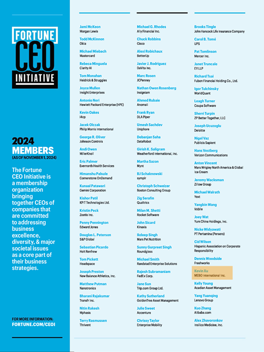 2024 年 12 月,《财富》杂志跨年期刊正式公布了财富 CEO 倡议 2024 年名单,美宝集团董事局主席、APEC 2023 筹委会主席徐鹏再度成功入列。自 2017 年财富 CEO 倡议发起以来,这已是徐鹏第五次登上该名单。