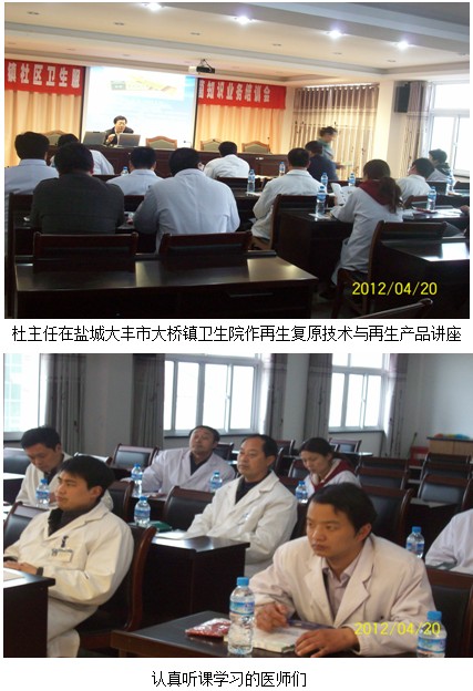 2012年4月20日中国中西医结合学会烧伤专业委员会委员、北京美宝烧伤创疡研究所临床部主任、烧伤创疡专家杜福勤与江苏省区刘恒主任驱车100余公里从姜堰赶赴盐城大丰市大桥镇卫生院,举办再生复原技术学术讲座,杜主任以“皮肤原位再生复原技术与再生产品”为题为大丰市大桥镇卫生院全体职工举办了再生复原技术讲座,该医院杨院长参加了再生复原技术讲座学习,杜主任通俗易懂的进行了演讲,讲解了再生复原技术的基础理论和美宝创疡贴与美宝疤痕软膏的临床应用方法、临床功能、临床疗效及愈后效果。介绍了美宝创疡贴的产品特点;临床注意事项和不良反应。深受参加学习的医护人员欢迎,为深入基层推广奠定了良好基础,达到了基层医疗单位深入推广地目的。