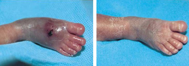 患儿胎龄35+6w。出生后17d,在静脉输注浓度为12.5%的全胃肠外营养液与10%英脱利匹特时,左足外侧出现渗漏性损伤。创面水肿呈白色并伴有面积为2.5cm X 1.5 cm的大水泡。发现水肿之后,立即将左足抬高并应用再生技术处理。9d后,创面出现面积为1.5 cmX 1.5 cm的坏死组织与脱屑(图6A)。治疗22d之后,创面全面愈合,除小面积挛缩外,无任何功能性异常。20个月的回访显示,未出现任何后遗症(图6.B)。
