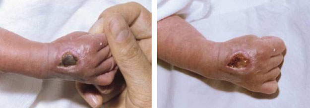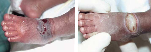 梨花女子大学木洞医院于2003年12月至2004年3月期间收治了5例早产儿,在该院的新生儿重症监护病房接受治疗,治疗前其父母均签订了知情同意书,此研究中的一切程序都是严格遵守伦理学标准以及赫尔辛基宣言而执行。患儿胎龄从28+4w~35+6w,平均胎龄为31+2w。平均体重从1140g~2680g,平均1930g。患病时间为出生后的17d~50d,平均32d。治疗方法使用抗生素加MEBO(美宝湿润烧伤膏)混合剂对创面进行局部治疗,每天换药1~2次,应用再生医疗技术治疗患儿创面具有创面愈合快、愈合质量高、无任何疤痕生成等显著疗效。