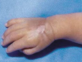 患儿胎龄33+1w,出生18d后,在左前臂进行12.5%的全肠胃外营养输液中发生渗漏,左前臂出现皮下水肿和局部组织坏死(图3),创面出现直径为0.5cm X 1cm的部分厚皮缺损。在水肿出现的一个小时内,使用再生技术处理,一个月后,创面全部愈合。