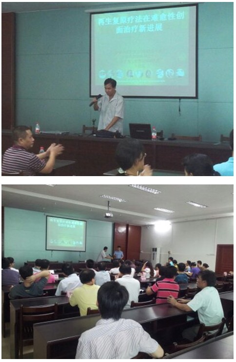 2012年7月30日,应该院热情的邀请,中国中西医结合学会烧伤专业委员会常委兼秘书、《中国烧伤创疡杂志》副总编辑、北京美宝烧伤创疡研究所副所长、第二临床研究部主任王洪生研究员来到该院,作学术和技术上的交流和探讨。下午3时,在医务科潘主任的主持下会议开始,全院职工各科室70余名相关专业的医护人员到会认真学习倾听王主任 “再生复原疗法在深度烧伤及难愈性创面治疗新进展”专题学术讲座,在学术讲座中,王主任结合大量真实的临床病例图片和图像,针对不同深度的烧伤创面及各类难愈性创伤、溃疡创面的规范化处理方法与技巧、注意事项等进行了细致地讲解,强调创面处理要大胆清创、减压、去除坏死组织,并保持创面生理的湿润环境,实现创面的再生复原,并建议对病人深达真皮层以下愈合后创面应进行防疤处理治疗.会议得到会议人员的高度赞扬。