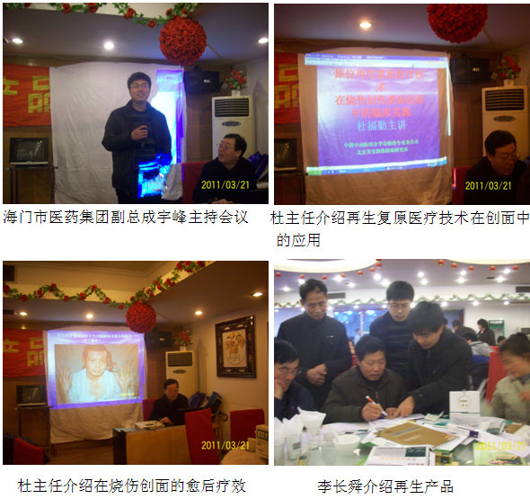 2011年3月21日,中国中西医结合学会烧伤专业委员会常委、北京美宝烧伤创疡研究所临床部杜福勤主任和江苏办事处李长舜同志冒着春天的细雨参加由海门市医药集团有限公司举办的海门市基层医疗单位技术与产品推介会,会议由海门市医药集团副总成宇峰主持,他介绍了山东鲁抗医药集团和美宝国际医药集团等20余家参会代表和参会产品。参加会议的还有来自海门市基层医院和卫生服务中心的主任和医护人员共70余人。