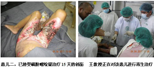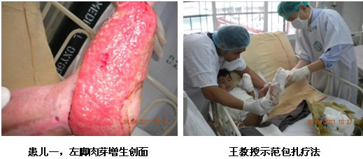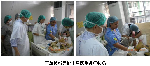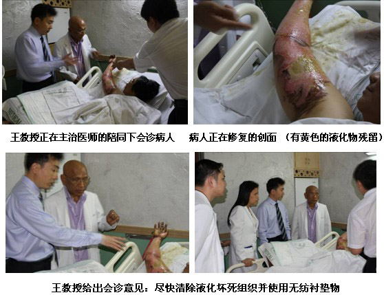 虽然培训结束了,但是一名外科高年资医生盛情邀请王洪生教授到病房会诊一名他们正在用再生医学技术治疗的烧伤患者。该病人是上肢深II度和I度混合烧伤患者,正在接受经典的暴露疗法来治疗。来到病房,当王教授看到黄色的液化物仍残留在创面时,他立即指出液化的坏死组织需要及时清除,并且强调需要使用无纺布的衬垫物,而不是现在所使用的棉质被单。因为只有这样才能保证创面湿润环境的保持,促进表皮干细胞的再生。主治医生和患者对王主任的到来,表示热烈欢迎,并非常感谢王主任的指导。他们表示马上为患者换药并清洁创面。