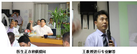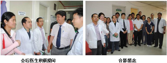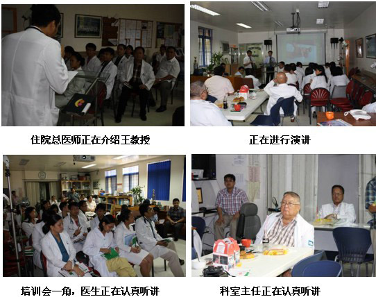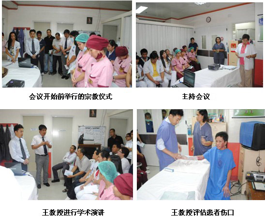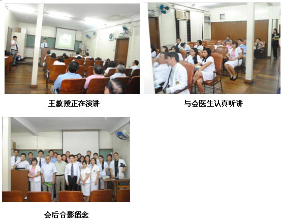 随后来到该院普外科会议室,对普外科医护人员进行再生医学技术在慢性创疡病例上的展示及治疗药店。各种慢性创面包括糖尿病足,褥疮,动、静脉溃疡。共计30名外科及烧伤科医生参加。该院院长也来到会议室,与王主任进行交流,并参加了整个培训来充分了解再生医学技术。有一名医生Pradez Sapkofa,他是菲律宾人,但曾经在山东学医6年,能熟练使用中文。会后,他用中文亲切地称王洪生教授为王老师,并紧握王教授的双手说真是神奇的技术并为中国感到骄傲和自豪。