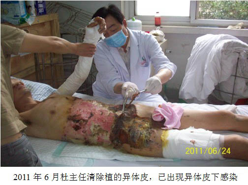 患者刘某回想起住院的那段日子,“经济困难压得我们夫妻俩简直喘不过气来,几次都想寻短见一走了之,传统技术植皮已花掉近10万元,创面又出现植过异体皮的下面感染,在这样的情况下,北京专家杜福勤主任彻底清除了已感染的异体皮,应用再生复原技术和MEBO湿润烧伤膏治疗为我精心治疗,杜主任每天给我清创换药,创面一天天日渐好转,一周后创面明显缩小。当时杜主任有事去其它地方治疗病人,走后第二天,医院又将治疗方法改成了传统治疗方法,朝创面上喷碘伏、用碘伏纱布覆盖创面,疼得我简直难以忍受,盼着杜主任早日回来给我治疗,在我电话的不断催促下,三四天后杜主任回到皖北总院重新给我恢复了再生复原技术治疗,我真的是非常幸运。从应用再生复原技术治疗到全部创面愈合总共费用一万元左右,不论从经济上还是自身痛苦度上来讲,我都是一个极大的受益者,感谢北京烧伤研究所的杜主任!感谢再生复原技术!感谢再生复原技术发明人徐教授!”