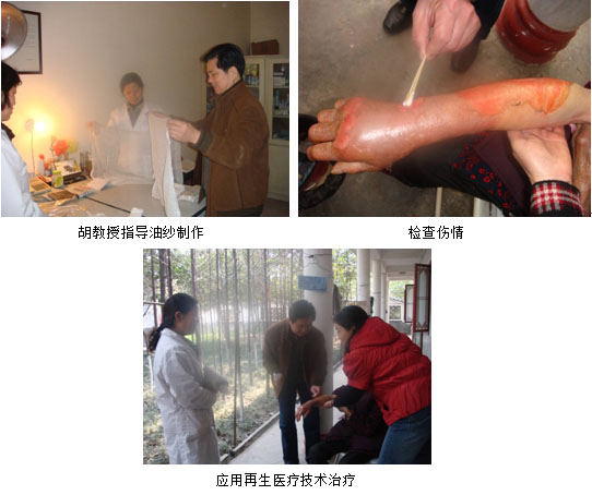 2009年2月27日,成都市敬老院一位老人不慎被烫伤,经医生诊断为:深Ⅱ度烧伤,15%TBSA。因敬老院医务人员缺乏烧烫伤的救治经验,他们就向临近的四川省中西医结合学会咨询救治方案。省学会李成林秘书长了解情况后,立即致电中国中西医结合学会烧伤专业委员会胡教授,请其协助救治。胡教授闻讯立即和烧伤专业委员会四川办事处工作人员带上再生医疗药品在秘书长的陪同下及时赶到了成都市敬老院,现场指导敬老院的医务人员运用再生医疗技术和药品对烫伤的老人进行救治,并在敬老院医务室对医护工作人员进行了再生医疗技术的讲解和要点技术的再次示范,同时告诉医务人员再生医疗技术还能广泛的应用于褥疮、皮肤溃疡等创疡性疾病,如治疗过程中还需要其它技术支持可随时联系。敬老院的医护人员十分感谢胡教授将这项先进的再生医疗技术教给他们,并表示要用这项技术为更多的老年人解除疾痛!