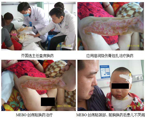 14日~17日,杜福勤主任再次来到烧伤科,在齐国选主任的带领下看望了住院的烧伤和整形患者,并给予再生技术处理换药。15日给予示范换药治疗,得到患者及家属的认可和欢迎,特别是幼儿患者,应用再生技术换药后,患儿立即停止哭闹;16日,应用MEBO创疡贴给颈胸部烫伤患儿和上下肢烧伤植过自体皮的患儿换药治疗,收到了良好的临床效果。