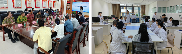 8月27日,访问团再次前往烧伤创疡科病房,在王乡宁主任的带领下对患者进行查房。通过床旁讲解,访问团了解到了进行多技术联合治疗的最佳时机以及辅助治疗对促进创面愈合的良好效果。病房参观结束后,双方医生围坐学习室,来自RSUD Dr. Soetomo医院整形外科的Agus Santoso Budi主任及来自RSUP Dr. Sardjito医院整形外科的Rianto Noviady Ramli主任分享了在印尼当地应用再生医疗技术治疗烧伤的经验,通过与中方专家的交流,代表团更加深入的了解到了如何在临床中正确应用该技术的治疗原则。