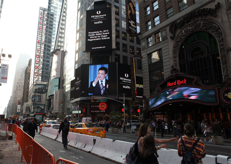 昨天,路透社在第一时间报道了徐荣祥博士获得2013年GOLDEN BIATEC 国际奖的新闻,同时在纽约时代广场大屏幕,刊出了徐荣祥博士的巨幅照,这是路透社第五次在纽约时代广场大屏幕刊登徐荣祥博士的巨幅照片。表明了路透社对器官再生科学极大的关注。也表明了世界已经进入“器官再生科学”的新时代。器官再生科学时代的到来,结束了上百年的生命科学的设计想象研究阶段,人类生命科学由虚拟的研究进入到人体应用研究阶段。