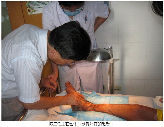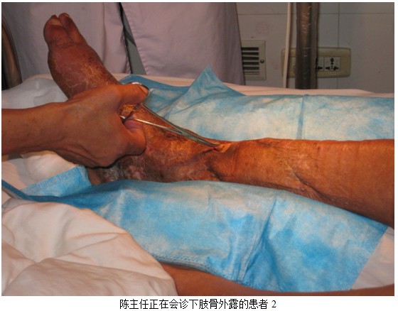2012年8月5日中国中西医结合学会烧伤专业委员会委员、北京美宝烧伤创疡研究所临床部专家陈全喜应河南省新乡医学院第三附属医院骨科李主任和孙大夫的邀请,会诊一例下肢骨露的患者。