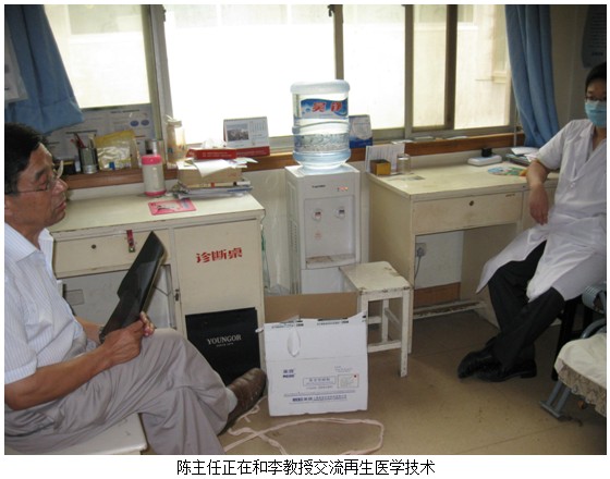 陈全喜同骨科李教授及孙副教授一块会诊病人。患者77岁,2011年12月4号,因车祸造成右下肢胫腓骨粉碎性骨折。从临床看,胫骨外漏长12cm,宽6.3cm缺损。骨表面色黄,骨边缘暗黄色,骨髓缺损(胫骨下端直踝关节,未发现有骨髓)。骨缺损处呈不规则形,固定钢板,固定针暴露,周围皮肤暗黑,边缘齐纯。李教授说:“我们已经做过六次手术,其他部位都长好了,就是这个部位长不住。”陈主任说:“临床最多见的是粉碎性骨折,尤其是胫前骨难以愈合。因为肌肉少血运差,再加上有其他原因,这个部位是骨科医生棘手的技术问题。这种创面需用一种培养细胞的物质对对其进行治疗,能起到一定的疗效。美宝皮肤再生技术目前是国际上较前沿的高科技技术,是培养创面局部缺损的细胞生长增殖,激活潜藏骨髓、骨皮肤的潜能细胞。由潜能细胞转化成体细胞,由体细胞转化为干细胞,修复骨髓,骨缺损,皮肤组织。最终完成创面修复任务。经过一段时间的治疗,效果就会出现。”