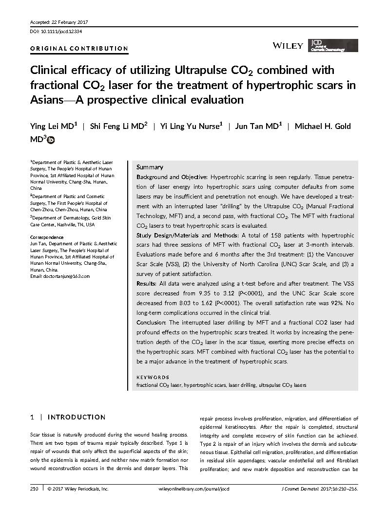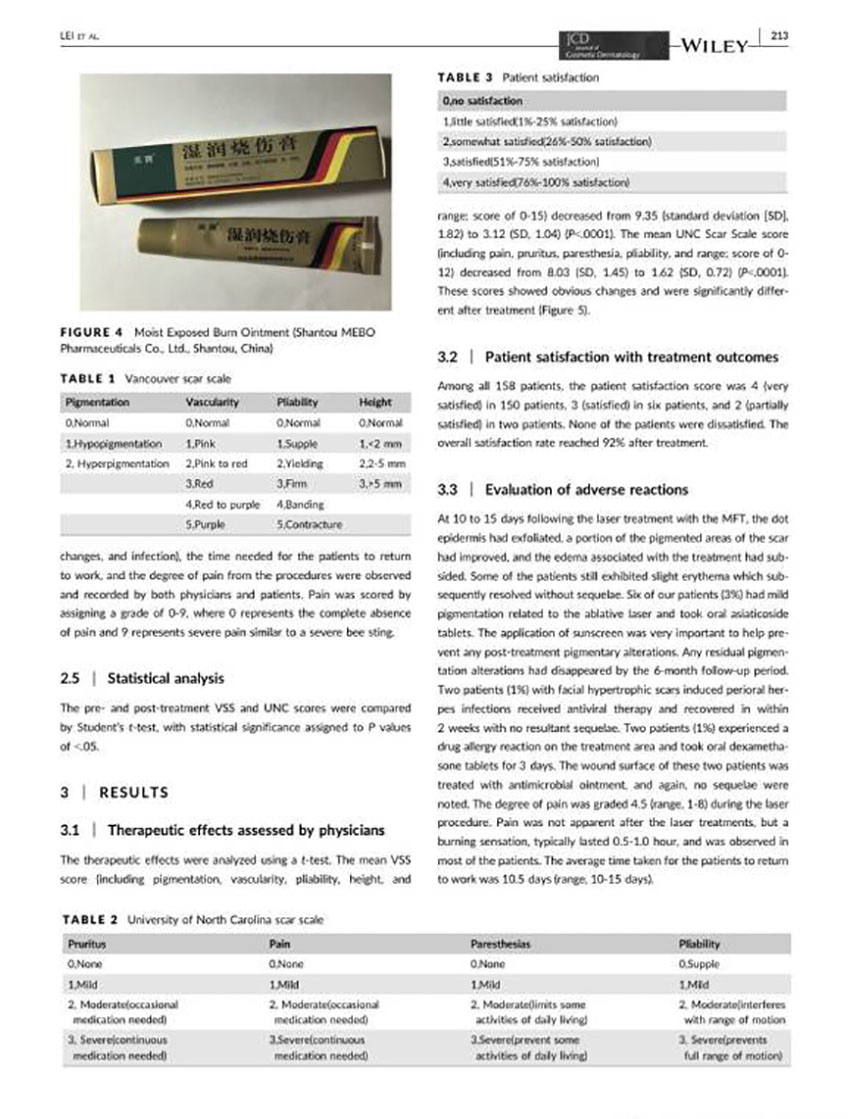 “湿润烧伤膏对超脉冲CO2点阵激光干预兔耳浅表性瘢痕真皮—表皮连接区组织学的影响”一文发表于中国出版的《中华医学美学美容杂志》及美国出版的《美容皮肤杂志》。