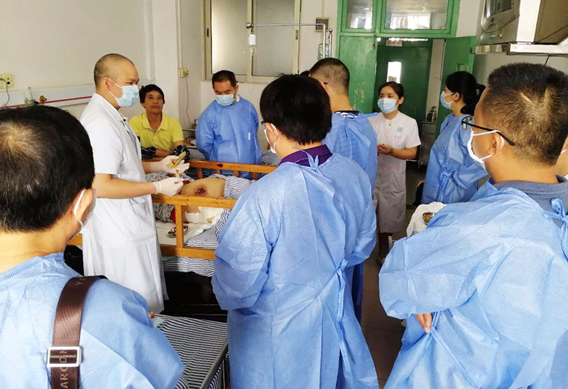 医疗专家们一行首先前往烧伤与创面修复科病房观摩再生医疗技术在烧伤、糖尿病足溃疡、压疮等创面的规范化治疗。病房观摩后,各医疗专家到会议室就再生医疗技术在慢性及难愈性创面的规范化应用进行了具体的学术交流及探讨。就再生医疗技术在糖尿病足溃疡、压疮创面、糖尿病足溃疡及皮肤病的良好应用效果进行了交流,还特别分享了再生医疗技术在眼镜蛇咬伤创面的临床处理等。