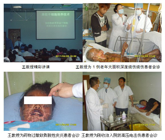 讲座结束后,王主任首先应该医院急诊科主任邀请到急诊科为一名药物过敏剥脱性皮炎患者会诊,指导医护人员怎样处理创面,每次换药的注意事项。而后又受胃肠及烧伤整形外科杨家成主任邀请,到该科为1例老年大面积深度烧伤患者会诊,并为一名刚入院的高压电烧伤患者会诊,指导医护人员要尽早行创面切开减压进行有限清创术,及手术的技巧和注意事项,杨主任感激的握着王教授的手欢迎他日后多来该医院现场指点工作。