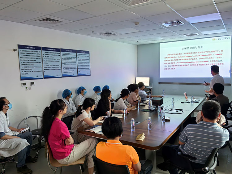 2024年5月24日,应广州市番禺区中医院创面修复科李敬矿主任邀请,中国中西医结合学会烧伤专业委员会常务委员、《中国烧伤创疡杂志》副总编辑王洪生,到科室查房会诊糖尿病足、压疮等创面病人。王教授亲自示范指导清创换药,并就创面处理过程中的要点进行详细讲解,受到医患人员的一致好评,随后进行学术交流。参加此次学术交流的有番禺区中医院、番禺区中心医院、番禺区第二人民医院、番禺区康复医院、番禺区化龙医院、番禺区钟村社区中心、番禺区南村社区中心、番禺区沙湾社区中心、番禺区东环街道社区中心等番禺区创面修复联盟单位从事创面修复的医护老师。王教授以《糖尿病足溃疡诊疗进展及规范化处理要点》为题进行学术交流,以大量临床病例结合手术操作视频分享再生医疗技术和微粒皮种植术等在相关慢性创面的应用及取得良好效果,受到与会人员的一致好评。烧伤创疡再生医疗技术的推广,不仅弘扬中国中医药传统文化,而且提高了临床医生的救治水平,解决临床复杂的难愈合创面治疗问题,可以提高患者的生存质量,减轻社会及家庭的经济负担。