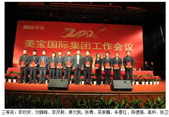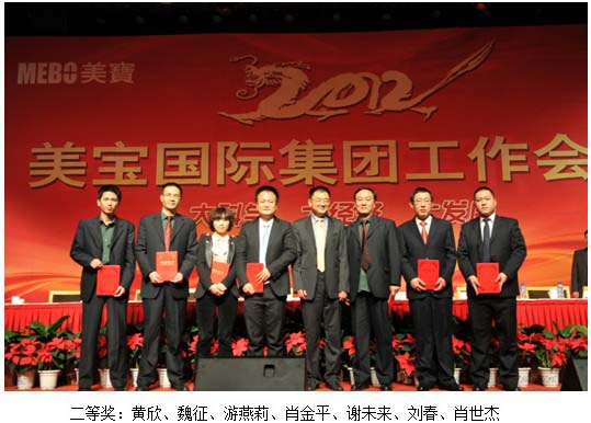 美宝烧伤创疡集团2011年度市场经营业绩表彰大会于2012年1月8日14:00在长安大饭店拉开帷幕。这次会议由烧伤创疡集团副总裁张坤主持,出席会议的有美宝国际集团董事局主席徐荣祥、烧伤创疡集团总裁杨智斌及烧伤创疡集团全体人员,并由徐荣祥主席亲自为所有获奖人员颁奖。