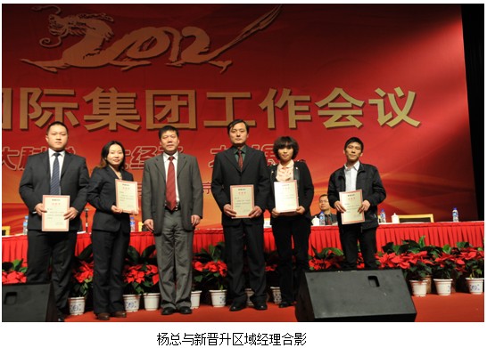 同时这次表彰大会还将张卫(浙江)、魏征(河北)、李招林(湖南)、游燕莉(四川)、葛艳研(河南)等5名2011年经营业绩好的业务员晋升为区域经理以表彰他们在2011年工作中的进步。这次表彰大会充分体现了烧伤创疡集团鼓励市场经营人员在市场营销工作中发挥比、拼、干的精神,取得骄人业绩,回报集团、回报社会。极大地鼓舞了广大市场营销人员的工作激情。