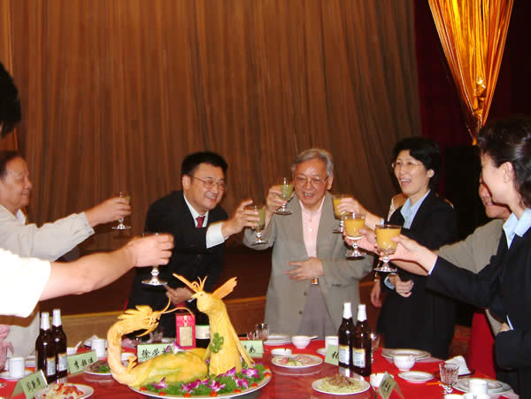 晚上,集团为庆祝8.16集团日和集团乔迁之喜,在华都大饭店举行了盛大的庆祝酒会,并邀请了原外国专家局局长马俊如、原卫生部药监局局长李超进、原卫生部药监局副局长粟福民、中新社副总编夏春平、科技日报副总编阎新华等几位嘉宾到会,会前徐总发表了简短的讲话,并诚挚感谢了在烧伤皮肤再生技术发展过程中给予支持和帮助的几位老领导。几位领导和嘉宾也发表了精彩的感言,大家纷纷赞扬了徐总所取得的骄人成果和高尚的人格魅力,并坚信美宝集团在以人类健康为宗旨的发展道路上会越走越远。酒会在热闹祥和的气氛中进行。