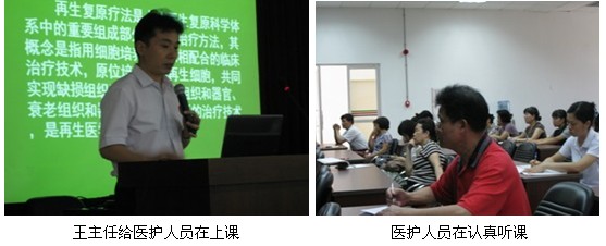 2011年06月14日,中国中西医结合学会烧伤专业委员会常委、中国烧伤创疡杂志社副总编辑、北京烧伤创疡研究所副所长、临床部主任王洪生研究员应邀到该医院以“再生复原疗法疗法在烧伤及难愈性创面临床规范化应用及新进展”为题进行了专题讲座。该院外科、骨科,以及内科等护理人员参加了讲座,在学术讲座中,王主任对烧伤及各种难愈性创伤,溃疡创面的规范处理方法与技巧并结合临床图片做了详细地讲解。