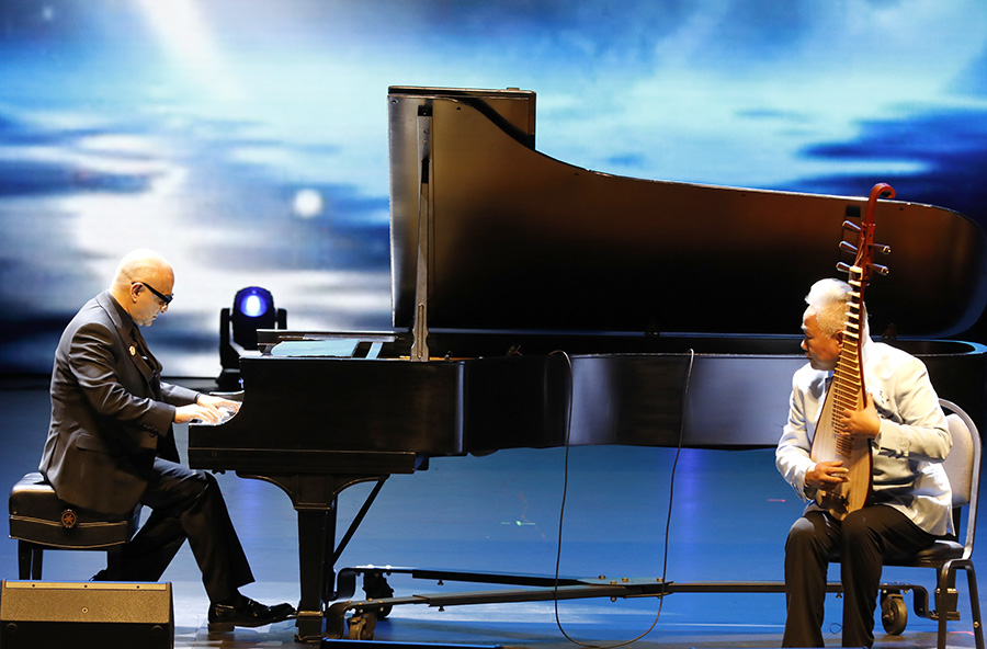 作为晚会亮点之一,格莱美音乐大奖得主奥玛尔携手中国国乐界的泰斗方锦龙,共同登台,开启了一场跨越东西、融汇古今的音乐盛宴与深度对话。奥玛尔先以他的经典之作《Take My Hand》为引子,引领全场观众穿越至一个绚烂多彩、异域风情浓厚的音乐幻境。随后,他与方锦龙携手合作,以《玄鸟》为曲目巧妙地将中西乐器之声交织在一起,展现了两种文化和谐共生、交相辉映的独特艺术魅力。紧接着,方锦龙再以一曲独奏《春江花月夜》将晚会推向了高潮。那悠扬婉转的旋律展现了国乐的深邃意境与无穷魅力,深深触动了每一位听众的心弦。