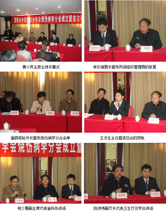 3月14日上午9时,金广达大饭店16楼会议室座无虚席,来自福建省中医学院、福建省人民医院、福建省医科大学第二附属医院、泉州医学高等专科学校、福建医科大学附属厦门第一医院、泉州市人民医院、龙岩市第一医院、邵武市立医院、永安市立医院等省、市32家医疗单位的45余名从事烧伤、创伤、溃疡等专业的专家、学者和业务骨干欢聚一堂,参加福建省中西医结合学会第一届烧伤病学分会成立大会暨学术研讨会,上午9时,举行了福建省中西医结合学会第一届烧伤病学分会成立大会暨学术研讨会开幕式,开幕式由福建省中西医结合学会烧伤病学分会主任委员、福建省人民医院中西医结合外科主任黄小宾主持,福建省卫生厅副厅长、福建省中西医结合学会会长阮诗玮、福建省科协副主席柯少愚、福建省民政厅民间组织管理局局长林珍瑞、福建省中西医结合学会秘书长、福建省卫生厅医政处副处长崔晓榕、中国中西医结合学会烧伤专委会常委、中国中西医结合学会烧伤专委会办公室主任、北京美宝烧伤创疡研究所副所长王洪生研究员应邀出席了开幕式并在主席台就座,在开幕式上,黄小宾首先宣读了中国中西医结合学会烧伤专业委员会及北京、广东、广西、云南、四川、重庆、陕西、湖南、河南、河北等省、直辖市、自治区中西医结合学会、中西医结合学会烧伤专委会发来的贺电,而后,福建省民政厅民间组织管理局林珍瑞局长宣布了“关于同意成立福建省中西医结合学会第一届烧伤病学分会”的批复,福建省中西医结合学会崔晓榕秘书长代表福建省宣读了福建省中西医结合学会“关于同意由黄小宾等35人组成福建省中西医结合学会烧伤病学分会第一届委员会的批复”,中国中西医结合学会烧伤专委会王洪生主任宣读了中国中西医结合学会烧伤专委会的贺词,福建省科协副主席柯少愚代表福建省科协对福建省中西医结合学会第一届烧伤病学分会的成立表示祝贺,接下来,福建省卫生厅阮诗玮副厅长代表福建省卫生厅、福建省中西医结合学会发表了热情洋溢的讲话,在讲话中阮副厅长高度赞扬了我国著名生命科学家、医学家、烧伤再生医学的发明人徐荣祥教授近年来所取得的重大实验及临床研究成果,向福建省中西医结合学会第一届烧伤病学分会的成立及各位当选委员表示热烈的祝贺,对与会的各位领导、嘉宾、专家表示亲切的问候。开幕式结束后,参加开幕式的领导、嘉宾与福建省中西医结合学会第一届烧伤病学分会委员及与会代表合影留念。