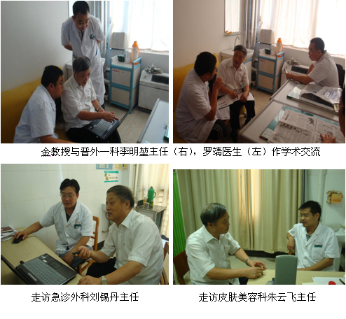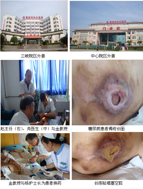 8月11日至8月13日,中国中西医结合学会烧伤专业委员会金党军教授走访了该医院三峡院区和中心院区的部分科室。金教授在走访期间分别与三峡院区外科赵延春主任、杨护士长,中心院区普外一科李明堃主任,急诊外科刘锡丹主任和皮肤美容科朱云飞主任进行了技术交流。赵延春主任在临床一直推广应用湿润烧伤膏和湿性医疗技术为大面积烧伤患者治疗,非常肯定其卓越的临床疗效。在金教授拜访赵延春主任时,他正为一位因腹腔镜手术插管形成的洞伤口患者应用美宝创疡贴换药。在金党军教授向赵主任和科室骨干肖医生介绍了目前再生医疗技术临床实践新进展后,他们表示通过对皮肤再生医疗技术对创伤、溃疡创面治疗良好效果的考察,他们正在构思创疡特色专业科室的建立。
