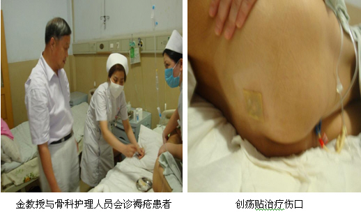 三峡大学仁和医院内一科是神经内科,呼吸内科和理化中毒的大科,该院郝巧蓉护士长和陈慧敏医生热情地接待了金教授。近期,该科接诊了一位淋巴结核创面的老年患者,该患之前在外科住院两个月,考虑到患者的年龄较大,医生未对该患施行手术。目前该患的创面,未有大量分泌物渗出,窦道已封闭。该院在为该患治疗时,曾用过安福消炎膏,龙血竭粉外敷于创面,效果不理想,后改用美宝创疡贴和湿润烧伤膏换药已有一个多月。金教授仔细查看了该患创面,创面有供血,但无渗液,金教授建议患者的主治医生继续使用美宝创疡贴和湿润烧伤膏联合换药,并讲解了换药时的注意事项。
