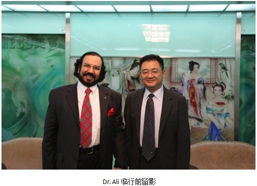 Dr. Ali十几年来一直使用美宝技术及配套治疗了许许多多的烧伤患者并在他所参加的各个会议上宣传美宝科学技术。此次来访期间,Dr. Ali还参加了在北京召开的第二届欧洲整形会议,并在会议上做美宝的演讲,反响十分强烈。他甚至用美宝的养生产品解决了很多人多年困扰的难题,如这次来访会谈间,他提起一个亲眼鉴证的神奇的案例,在他的建议下,他的一个不孕症朋友服用了美宝胶囊,八个月后发现居然不需要试管受精就成功自然受孕了。每当他谈起美宝科学技术和产品的神奇时总是满脸兴奋的神情溢于言表。