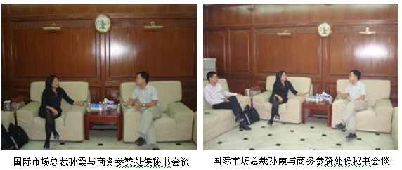 应中华人民共和国驻印度大使馆商务参赞处侯秘书邀请,国际市场总部总裁孙霞、市场总监刘钢、印度市场经理兼医学技术支持专员张印参观访问了中国驻印度大使馆商务参赞处,并受到了热情的欢迎与接待。关于印度投资情况、印度医药市场、中国企业在印度投资的情况等问题,国际市场总裁孙霞与侯秘书进行了深入的交流与讨论。侯秘书指出,美宝国际集团作为医药公司准备在印度投资,可谓是国内医药企业的先行者与带头人,印度条件较差,情况复杂,希望企业做好充分的思想准备,印度使馆是中国企业的重要后盾,将尽可能为所有中国企业提供帮助和交流平台。