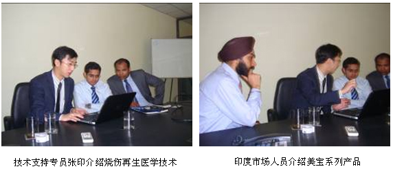 国际市场总部总裁孙霞、国际市场总监刘钢、印度市场经理张印应邀会见了印度第四十七大医药企业Jagsonpal, 就烧伤再生医学技术与美宝烧伤膏等产品的商务合作事宜进行了初步的会谈。