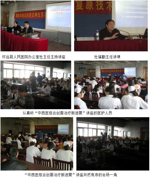 2012年10月21日至24日中国中西医结合学会烧伤专业委员会委员、北京美宝烧伤创疡研究所临床部主任杜福勤和学会驻安徽办事处张勇同志应怀远县人民医院办公室杜主任的邀请,23日下午15:00为怀远县人民医院外科、内科、妇产科、骨科、内二科、五官科等科室及中医院举办了“中西医结合创面治疗新进展”讲座,讲座由医院办公室杜主任主持,60余名医护人员参加了讲座学习,杜福勤主任结合临床实践图文并茂的介绍了再生医疗技术的创立、理论基础研究、临床实践以及国内外的临床实践研究和临床发展。介绍了2012年5月江苏南通国际学术会议成功召开的情况。下午五点,进行了二个多小时的讲座在多次热烈掌声中结束。会议介绍后,杜福勤主任应卫生局一位领导邀请为一名胆囊手术刀口不愈合患者会诊,介绍应用MEBO创疡贴换药治疗刀口难愈创面的方法和技巧,受到患者及家属的欢迎。